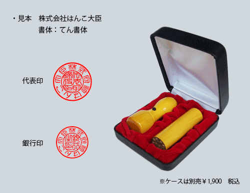 | ・代表印:18.0×60.0mm(天丸サヤ) ・銀行印:16.5×60.0mm(寸胴) ・書体・・・偽造されにくい。バランスが良い。 等の理由で、てん書体が人気です。 |