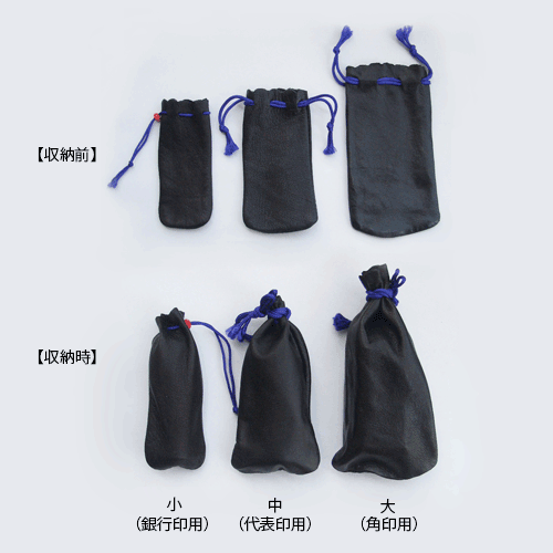 | はんこ1本ごとの牛皮収納袋です。 ・大(角印用)・中(代表・職印用)・小(銀行印用) ※使い始めは、皮袋裏地の皮片が、ハンコに 付くことがあります。 |